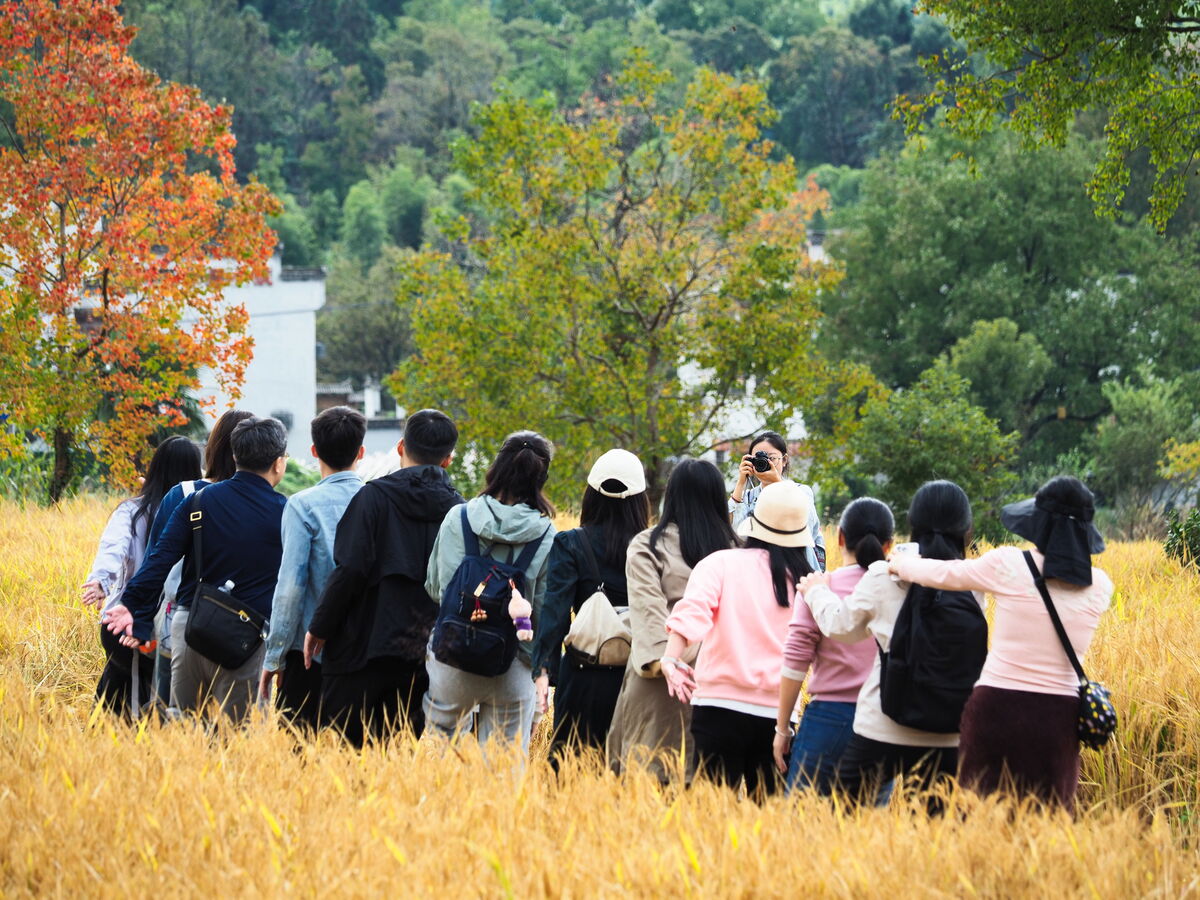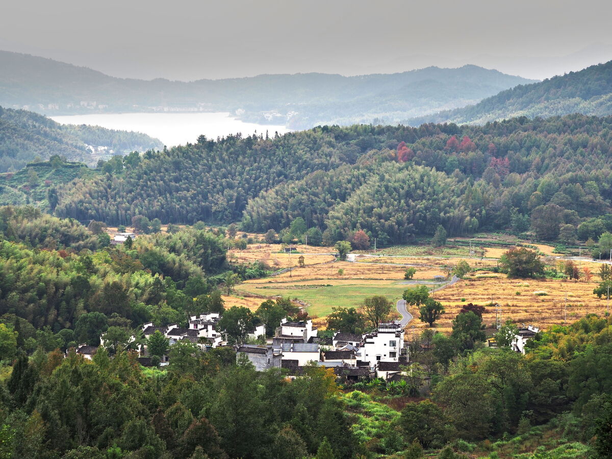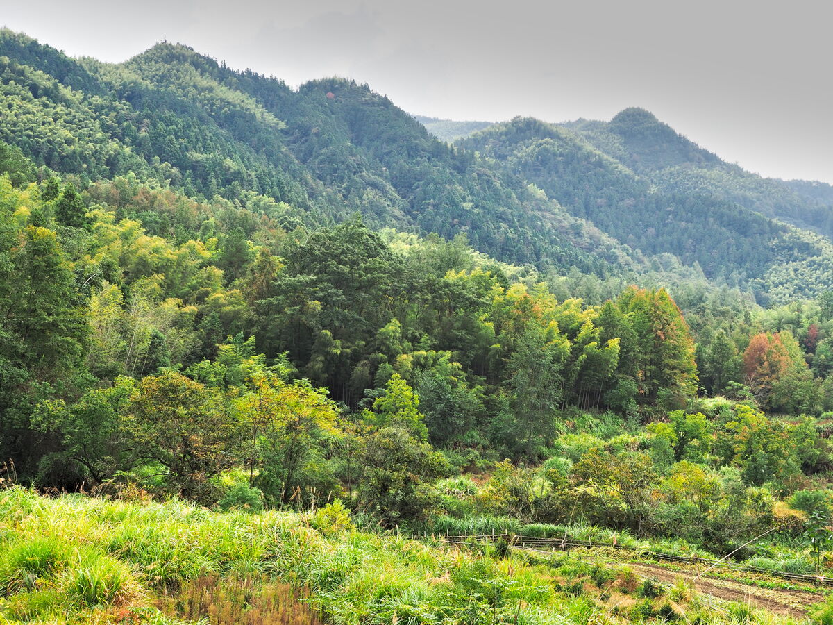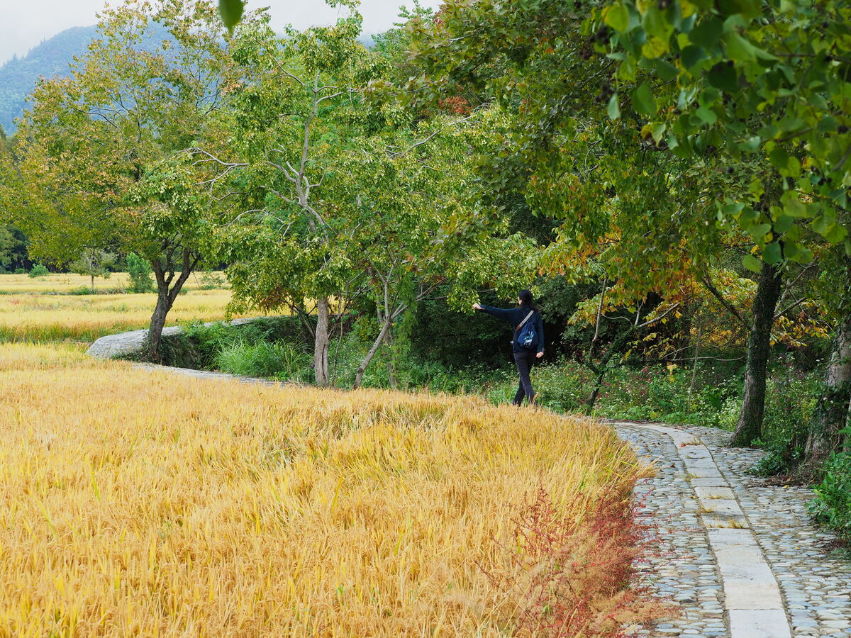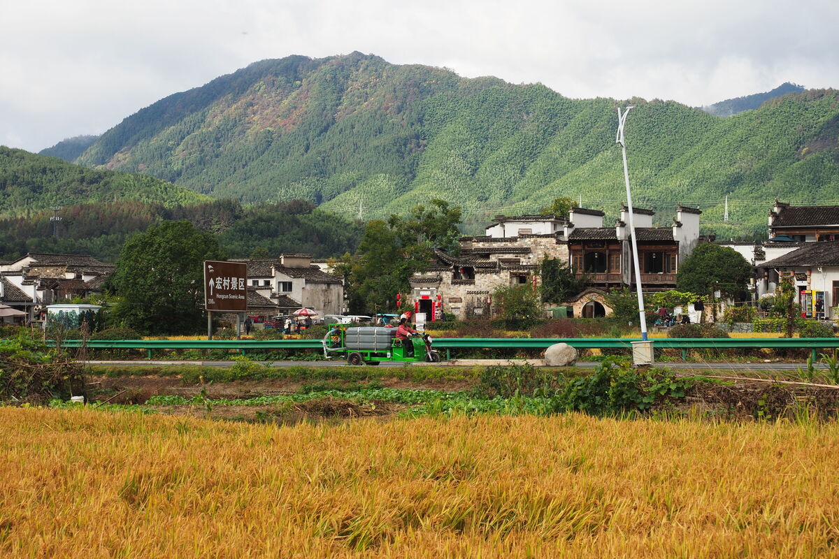 A hike between the rice fields and mountains near Hongcun Village and Tachuan Village in China, Anhui Province.